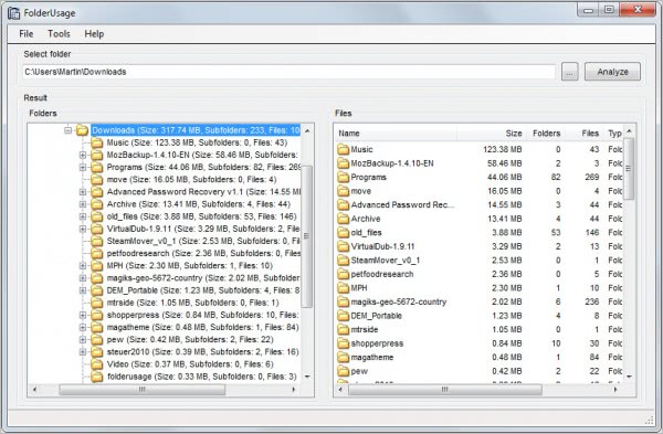 FolderUsage is a free program for the Windows operating system that can provide you with the information in a heartbeat. All you need to do to get started is to select a root folder on your system before hitting the analyze button.