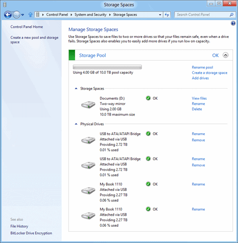This type of system has been around for a great many years in the form of RAID. Here’s it’s managed by hardware so is completely independent of the operating system you use. This means that should the need arise to perform a clean reinstallation of Windows (and trust me, that time will eventually come), the hardware will still effectively manage your pooled storage and you won’t lose any files and data.